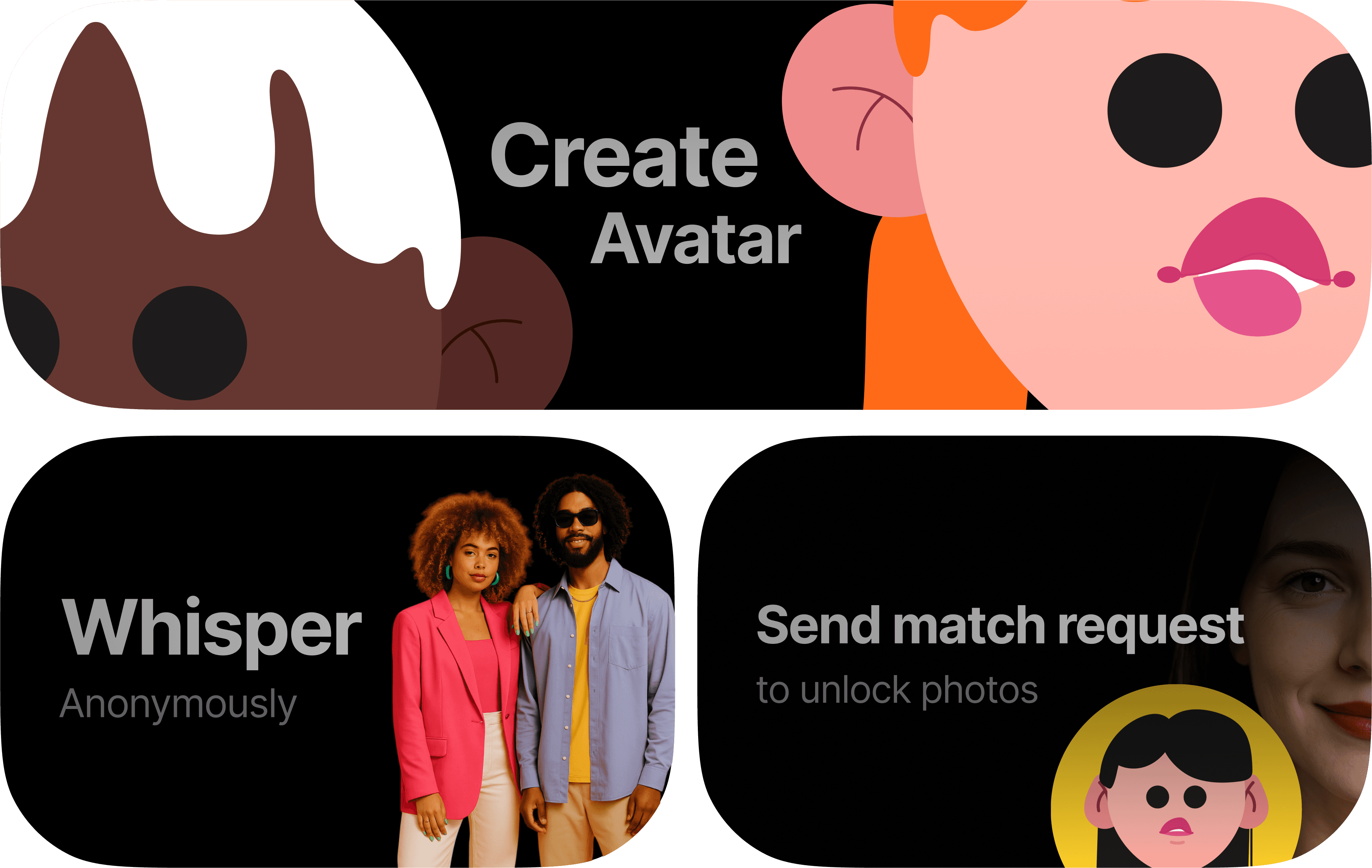 In the Feed, you appear with your avatar. Share moments, explore, like, comment, and follow people who interest you. Want something more private? Send a Whisper for an anonymous chat. Ready to take the next step? Send a match request. If they accept, photos unlock — simple as that.